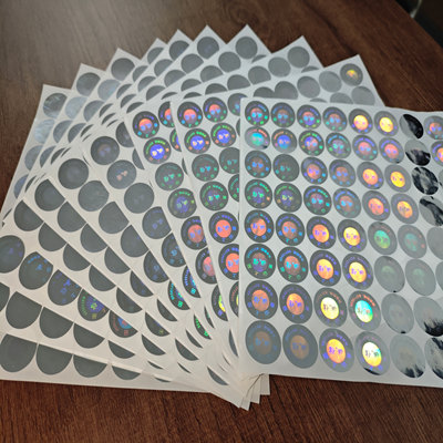 The product is 2 cm circle Hologram labels(holographic labels).Hologram labels create colorful, variable optical effects on film via laser holography and diffraction, with appearance shifting by viewing angle to show rainbow textures, 3D patterns or microtext; highly recognizable, they are decorative, anti-counterfeiting and widely used in packaging, certificates, tobacco, alcohol, cosmetics and brand security.